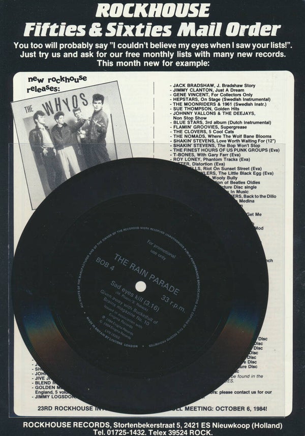 [104082] Nigel Cross [ed.]. London, UK. 1984. 21.0x29.7cm. 36pp. First edition. Rain Parade - Felt - Hoodoo Gurus - The Plimsouls - The Mad Violets - The Pretty Things - The Leaving Trains - The Surfin' Lungs - Green On Red - . Condition: excellent, complete with The Rain Parade "Sad Eyes Kill" flexidisc.