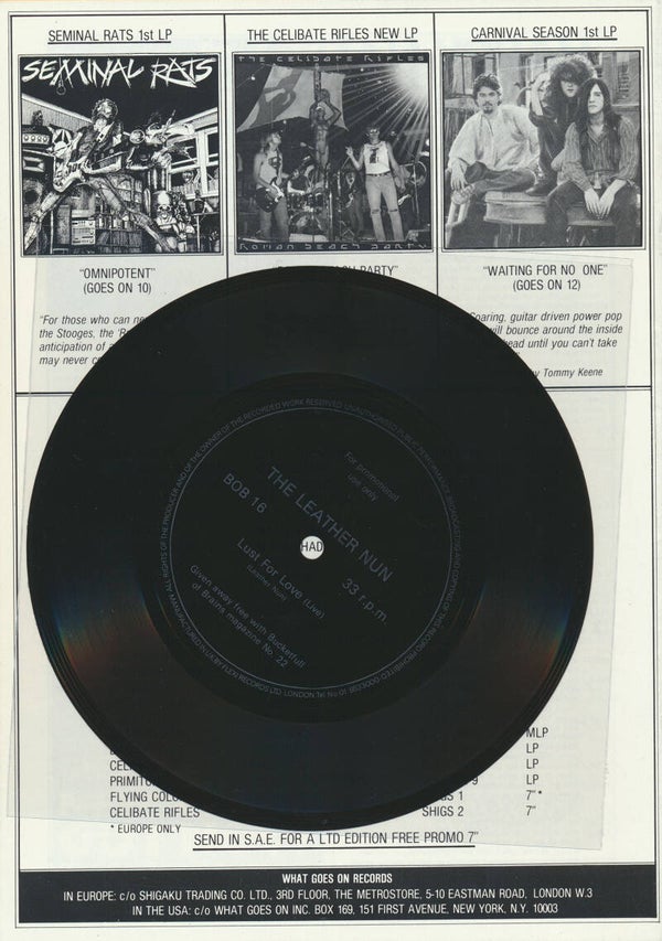 [104092] Jon Storey [ed.]. London, UK. September 1987. 21.0x29.7cm. 36pp. First edition. The Leather Nun - The Droogs - Hüsker Dü - Flamin' Groovies - Gene Clark - Nake Prey - The Smithereens - The Shamen. Condition: excellent, complete with The Leather Nun flexidisc.