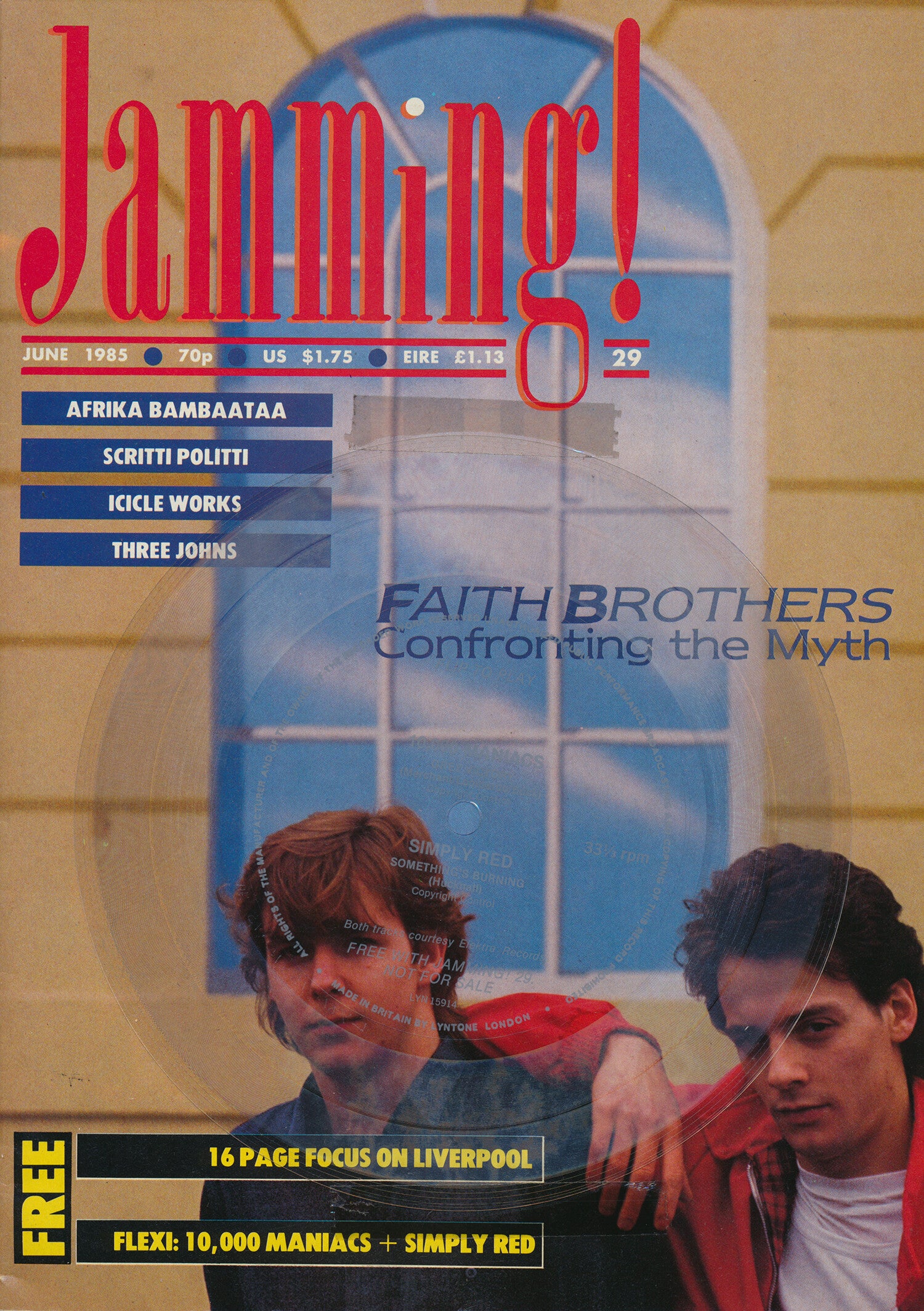 [104474] Tony Fletcher. London, UK. June 1985. 21.0x29.7cm. 48pp. First edition. Faith Brothers - Afrika Bambaataa - Scritti Politti - Icicle Works - Three Johns. With 10,000 Maniacs / Simply Red flexidisc Grey Victory / Something's Burning. Condition: very good plus, complete.