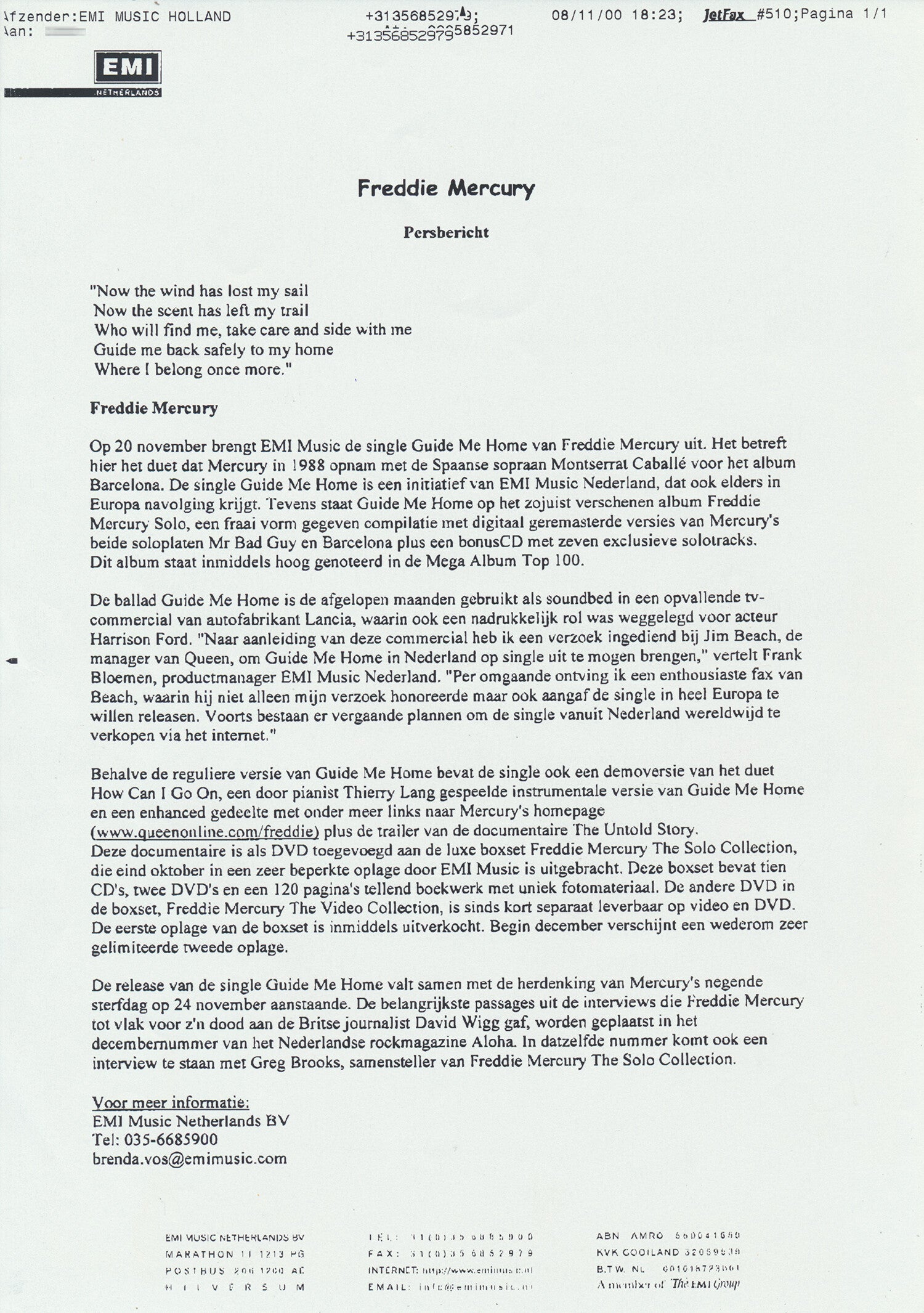 [104888] EMI Netherlands. Hilversum, The Netherlands. November 8, 2000. 21.0x29.7cm. 1pp. Original Fax Transmission. Condition: very good plus.