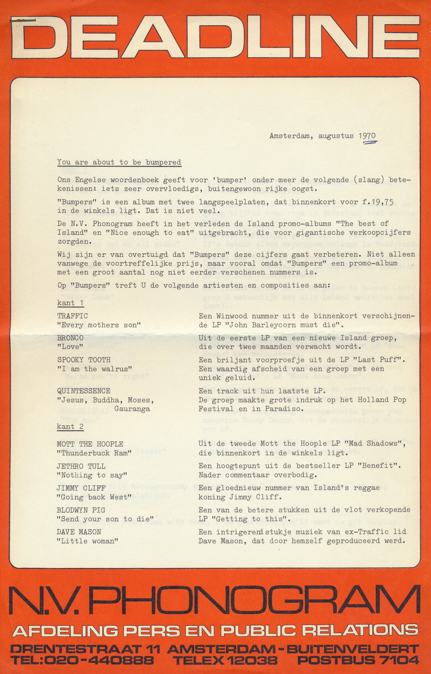 [105073] Phonogram B.V. Amsterdam-Buitenveldert, The Netherlands. August 1970. 21.0x32.5cm. 2pp. Stapled. Original. Condition: very good plus, annotated, folded.