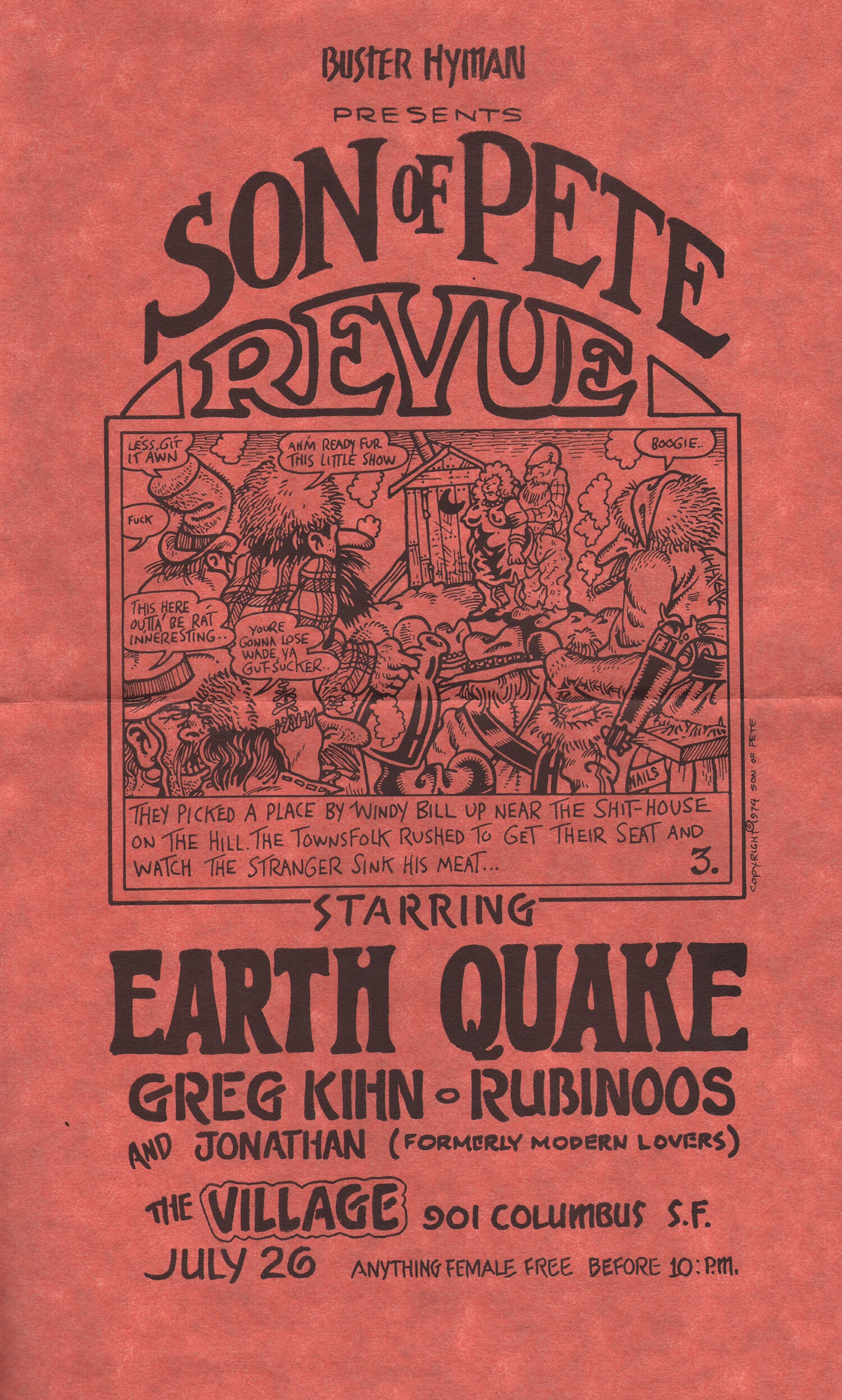 [105515] The Village, San Francisco, USA. July 26, 1974. 21.5x35.5cm. Original. Earth Quake - Geg Kihn - Rubinoos - Jonathan Richman. Condition: very good plus, folded.