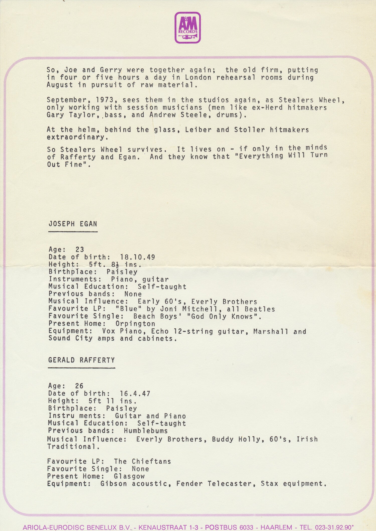 [105646] Ariola-Eurodisc Benelux B.V. Haarlem, The Netherlands. 1973. 21.0x29.7cm. 2pp. Stapled. Original. Condition: very good plus, folded.