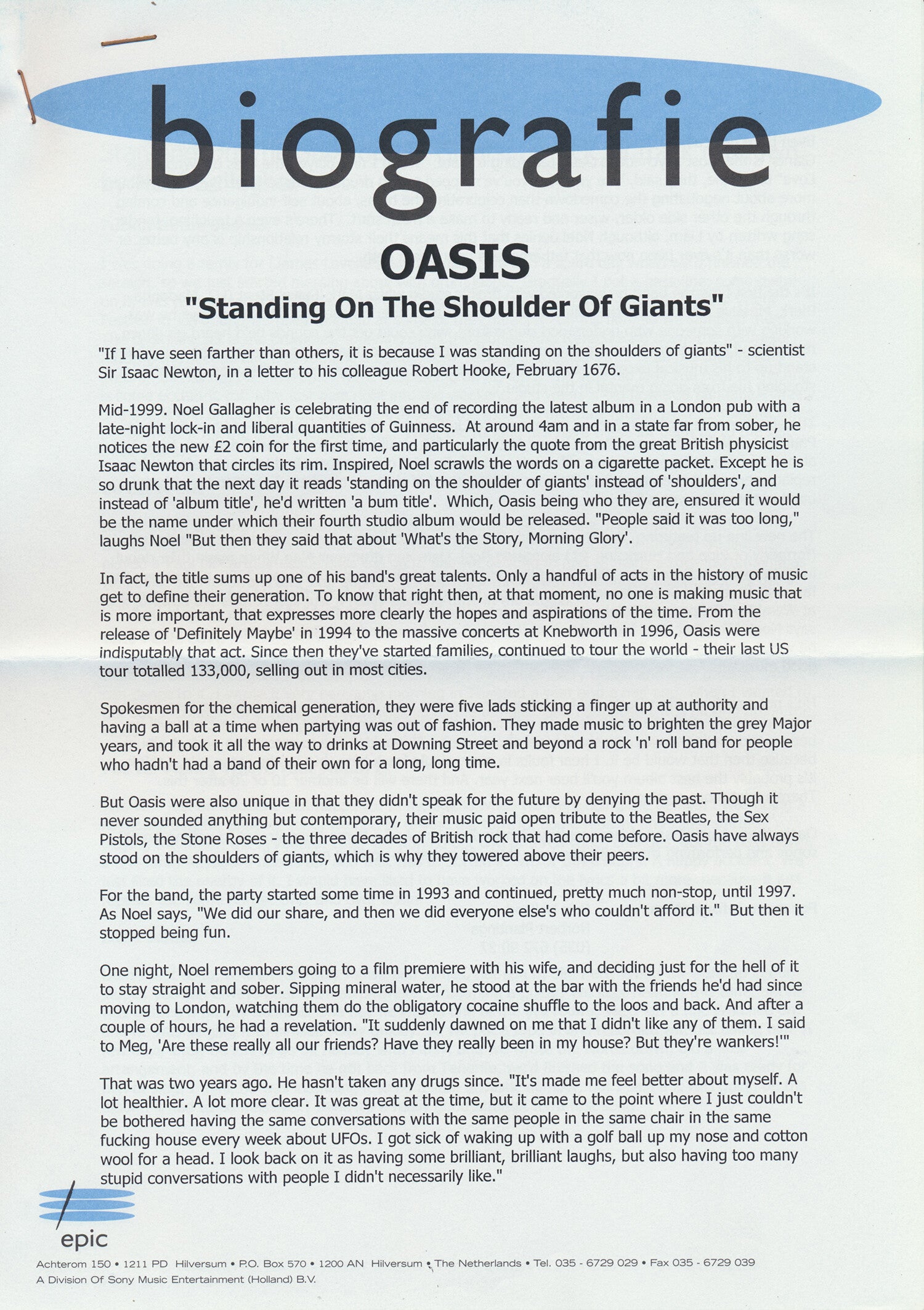 [105761] Epic / Sony Music Entertainment. Hilversum, The Netherlands. 2000. 21.0x29.7cm. 4pp. Stapled with postcard. Condition: very good plus, folded.