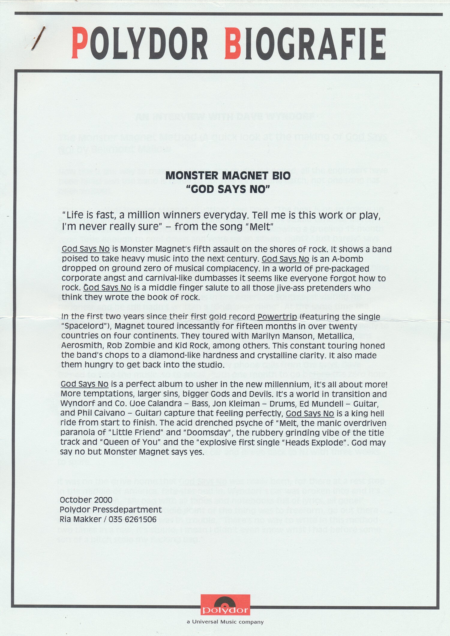 Monster Magnet - God Says No - October 2000 [Holland] - Press Release