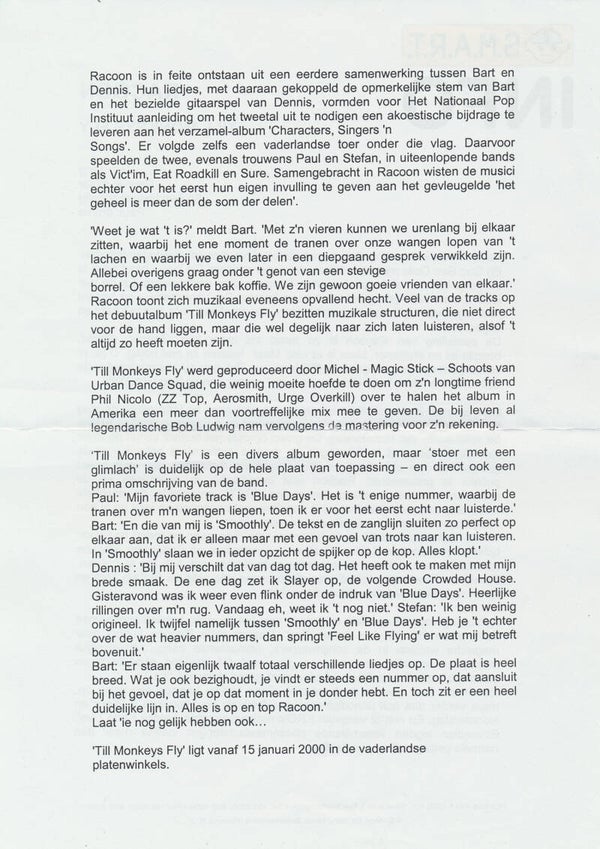 [105854] S.M.A.R.T. / Sony Music Entertainment. Hilversum, The Netherlands. 2000. 21.0x29.7cm. 2pp. Original. Condition: very good plus, folded.