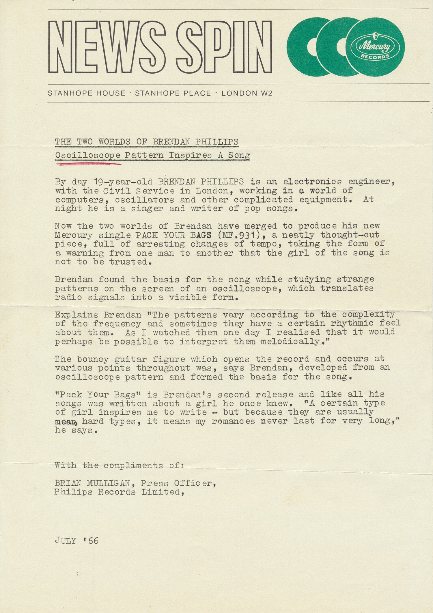 Brendan Phillips - Pack Your Bags - July 1966 [UK] - Press Release