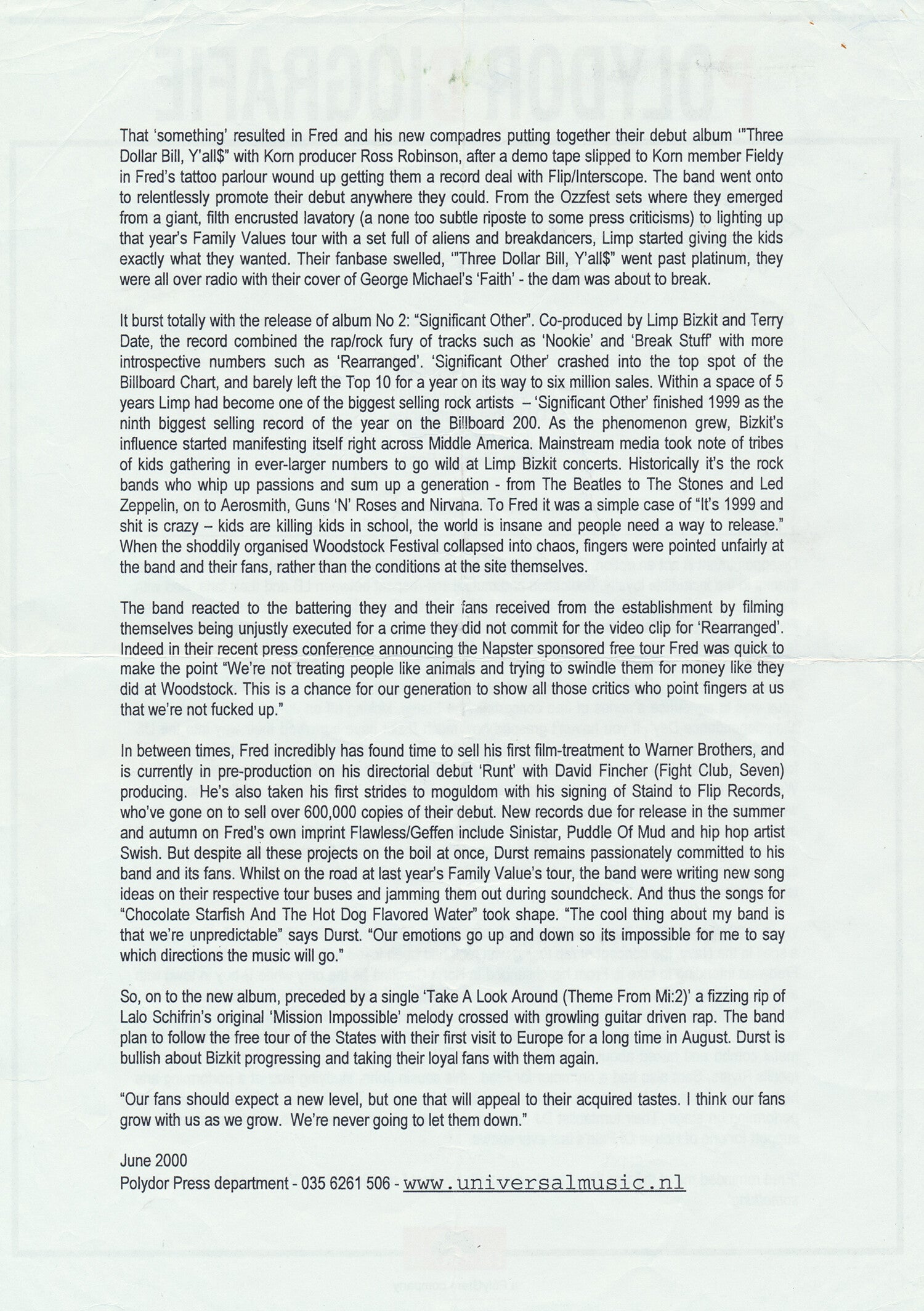 [105990] Polydor. Hilversum, The Netherlands. June 2000. 21.0x29.7cm. 2pp. Original. Annotated. Condition: very good plus, folded.
