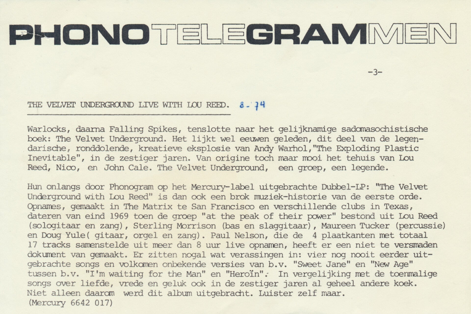 The Velvet Underground - Live With Lou Reed - August 1974 [Holland] - Press Release