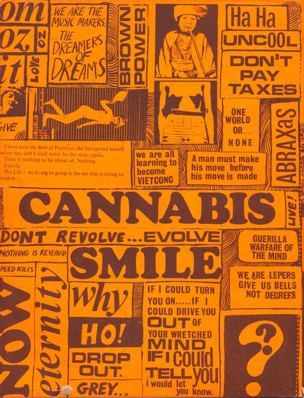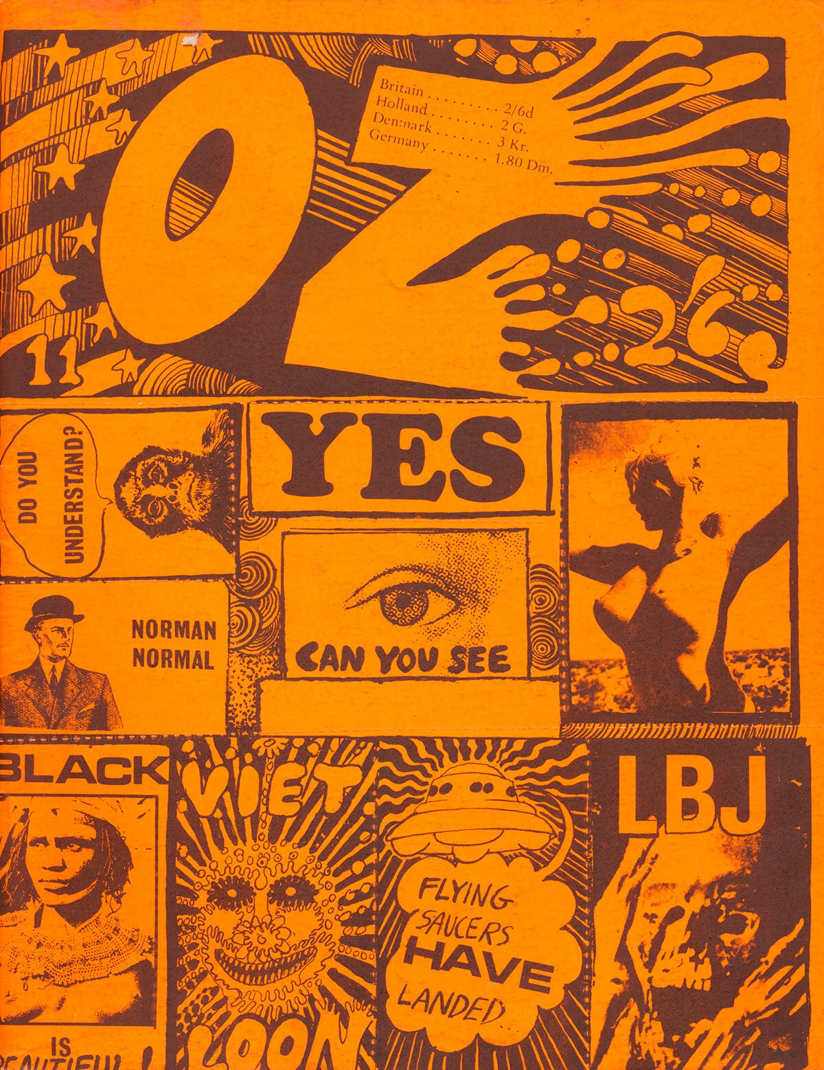 [100217] OZ Publications Ink Ltd., London, UK. March 1968. 27.0x21.0cm. 36pp. First edition. With red dayglow perforated sticker cover designed by Martin Sharp. Yes - Arthur Lee - Love. Condition: very good plus, few pages with stain on top edge, bit of wear, cover in great shape, complete.