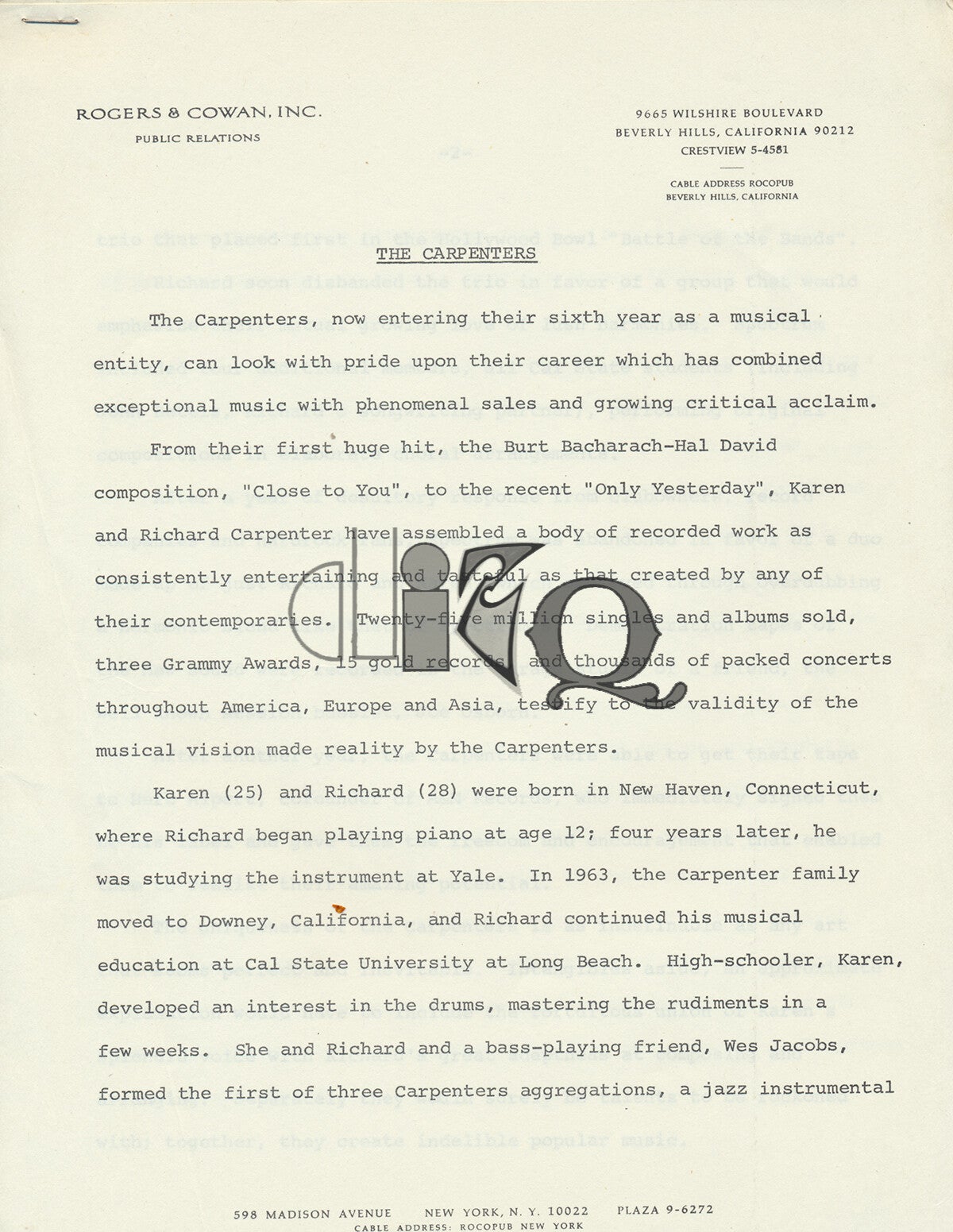 [100541] Rogers & Cowan, Inc. Beverly Hills. USA. 1975. 28.0 x 21.5cm. 4pp. Complete with 25.5 x 21.5cm press photo. Condition: excellent.