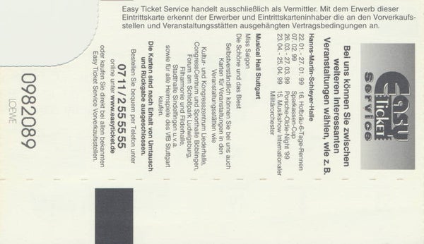 [100686] Marshall Arts. Schleyerhalle, Stuttgart, November 6, 1999. 13.9x8.2cm. Condition: excellent.