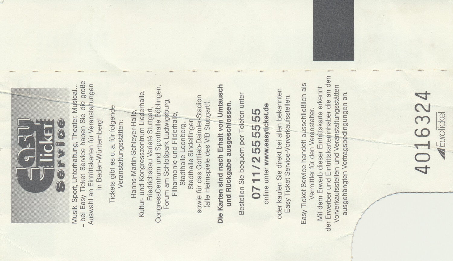 [100689] Mama Concerts & Rau. Schleyerhalle, Stuttgart, March 6, 2001. 13.9x8.2cm. Condition: very good plus, folded.