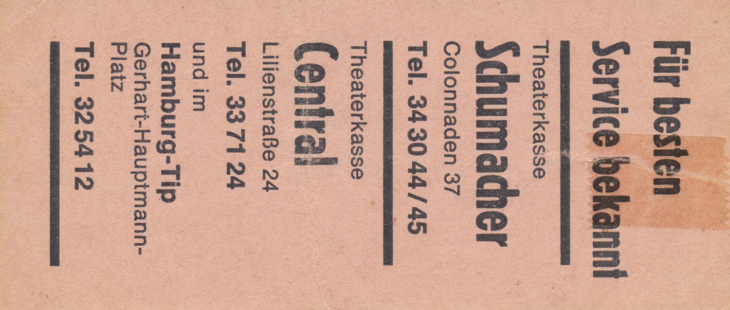 [100699] Karsten Jahnke Konzertdirektion. Auditorium Maximum, Hamburg, April 25, 1970s. 11.7x5.1cm. Condition: very good plus, cancellation tear repaired.