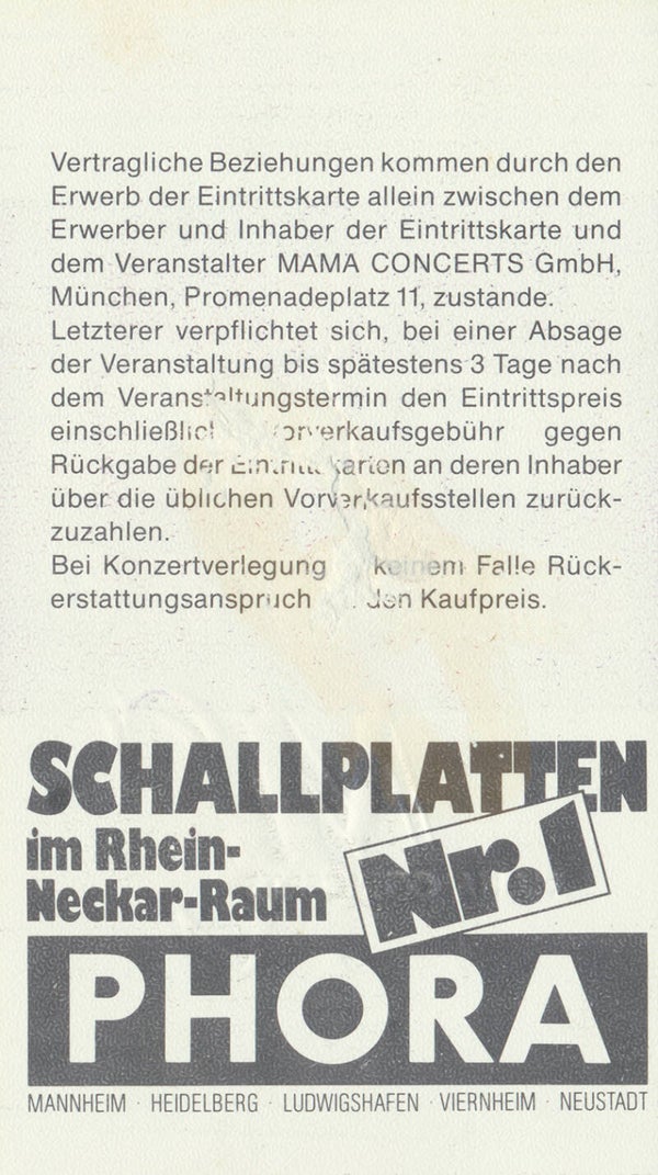[101057] Mama Concerts. Rosengarten, Mozartsaal, Mannheim, April 12, 1987. 7.0x12.3cm. Condition: very good plus.