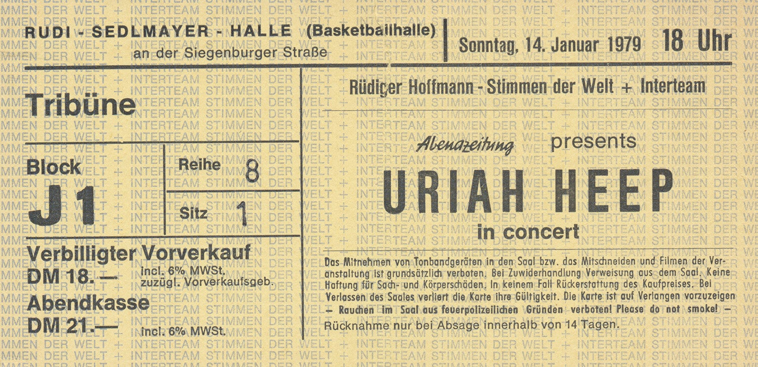 [100997] Rüdiger Hoffmann + Stimmen der Welt + Interteam. Rudi-Sedlmayer-Halle, Munich, January 14, 1979. 15.1x7.4cm. Condition: very good plus, cancellation tear.