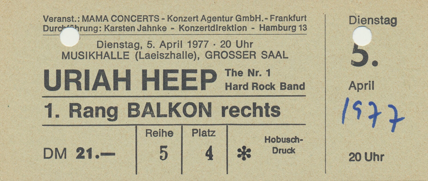 [100993] Mama Concerts. Musikhalle, Hamburg, April 5, 1977. 11.8x5.1cm. Condition: very good plus, cancellation tear.