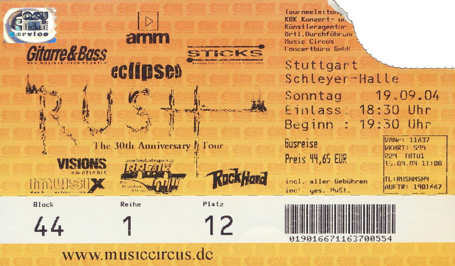 [100884] Music Circus. Schleyerhalle, Stuttgart, September 19, 2004. 13.9x8.1cm. Condition: very good plus, cancellation tear.