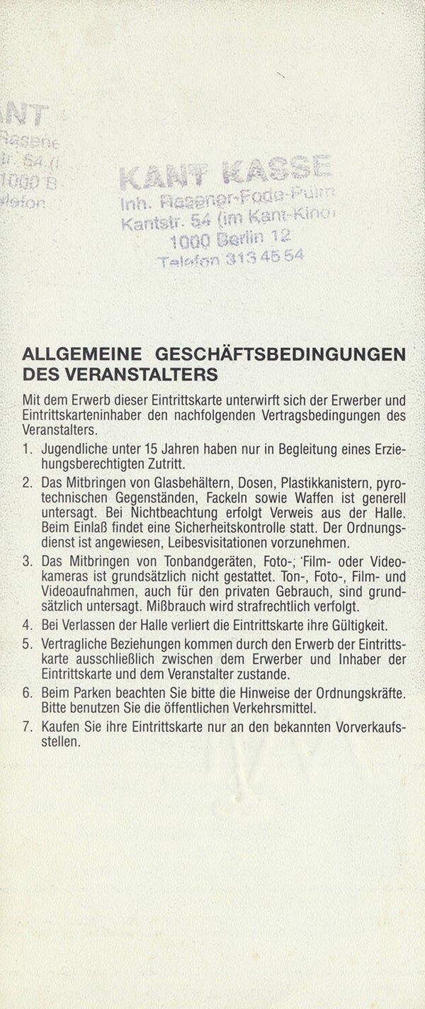 [101301] Concert Concept. Metropol, Berlin, October 30, 1990. 7.9x18.7cm. Condition: excellent.