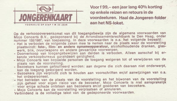 [101143] Mojo Concerts / Diba International. Beursgebouw, Eindhoven, March 25, 1992. 11.5x6.6cm. Condition: very good plus.