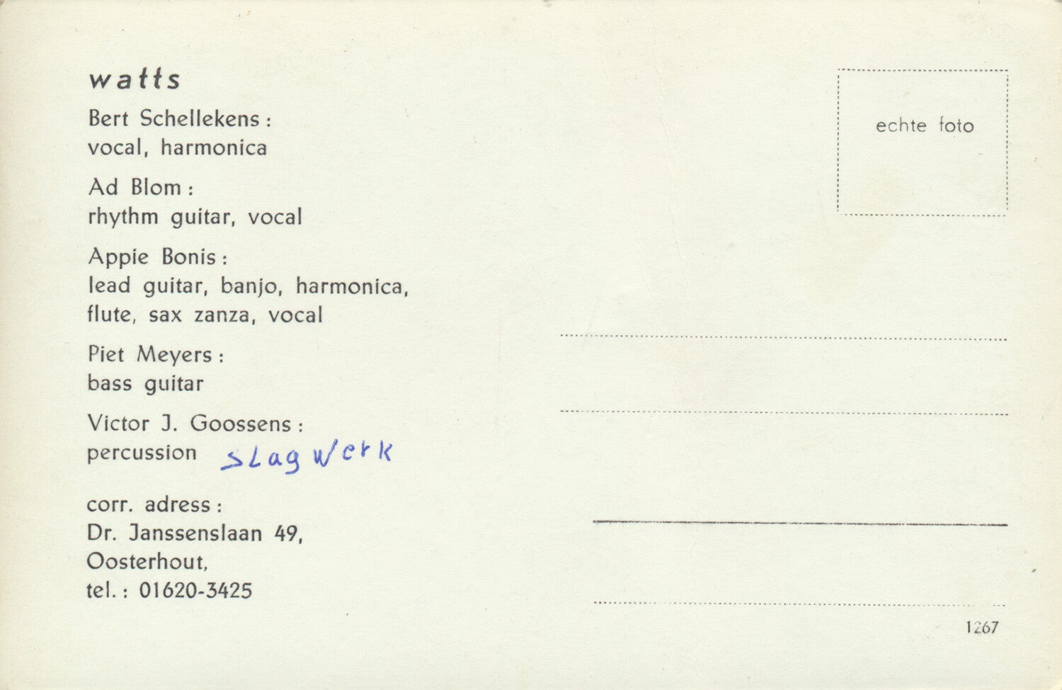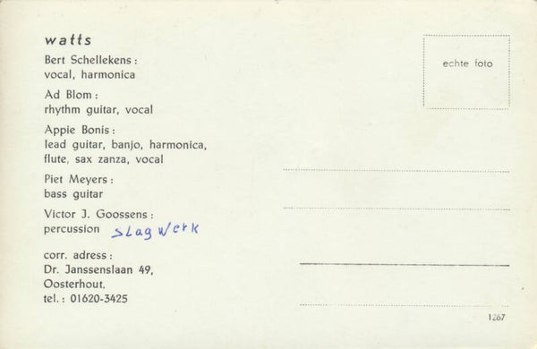 [101523] Nederbeat/Nederbiet act from Oosterhout. 1960s. 13.8x9.0cm. Bert Schellekens - Ad Blom - Appie Bonis - Piet Meyers - Victor J. Goossens. Condition: very good plus, folded