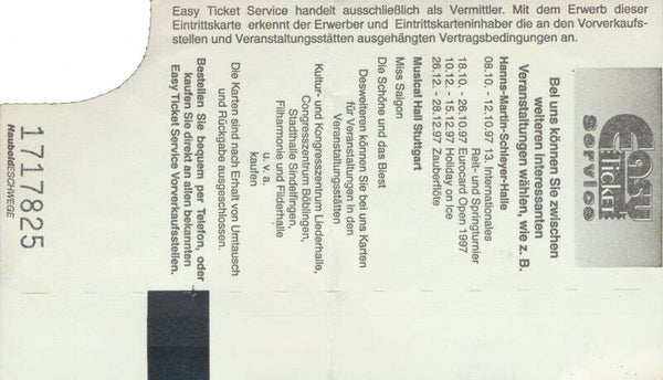 [100789] Marshall Arts. Schleyerhalle, Stuttgart, May 7, 1998. 13.9x8.2cm. Condition: very good plus, folded.
