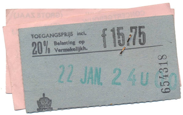 [102785] Concertgebouw, Amsterdam, January 22, 1972. 8.8x4.4cm. Stapled set of two tickets (row 3, seats 26 and 27), complete with tax stripx. Original Concertgebouw tickets were only dated and not name stamped. The result is that very, very few survived. This ticket comes from the original owner and visitor of the concert. The gig was recorded for the legendary The White Yes Album bootleg. Condition: very good plus.
