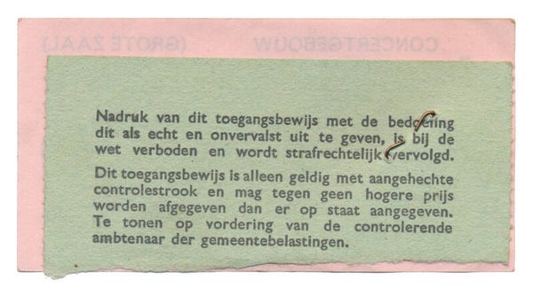 [102784] Concertgebouw, Amsterdam, October 31, 1971. 8.8x4.4cm. Complete with tax strip. Original Concertgebouw tickets were only dated and not name stamped. The result is that very, very few survived. This ticket comes from the original owner and visitor of the concert. Condition: very good plus.