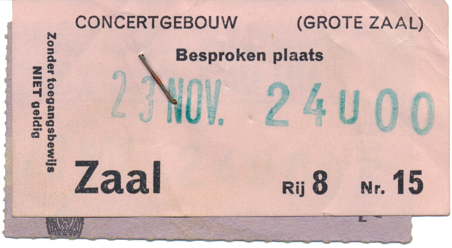 [102715] Concertgebouw, Amsterdam, March 31, 1973. 8.8x4.4cm. Complete with tax strip. Original Concertgebouw tickets were only dated and not name stamped. The result is that very, very few survived. This ticket comes from the original owner and visitor of the concert. Condition: very good plus.