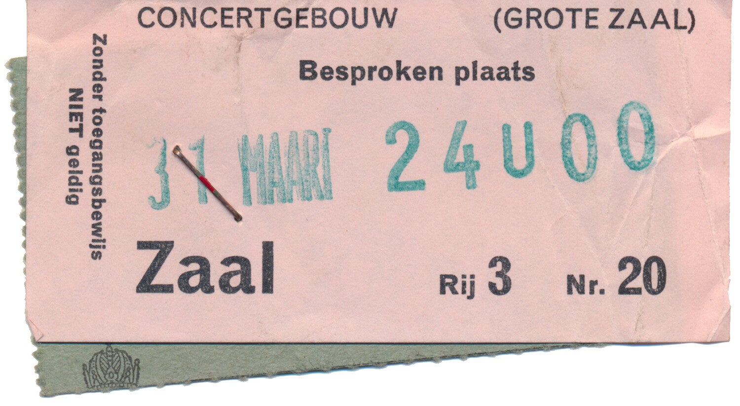 [102714] Concertgebouw, Amsterdam, November 23, 1973. 8.8x4.4cm. Complete with tax strip. Original Concertgebouw tickets were only dated and not name stamped. The result is that very, very few survived. This ticket comes from the original owner and visitor of the concert. Condition: very good plus.
