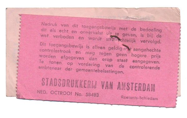 [102632] Concertgebouw, Amsterdam, May 31, 1974. 8.8x4.4cm. Complete with tax strip. Original Concertgebouw tickets were only dated and not name stamped. The result is that very, very few survived. This ticket comes from the original owner and visitor of the concert. Condition: very good plus.