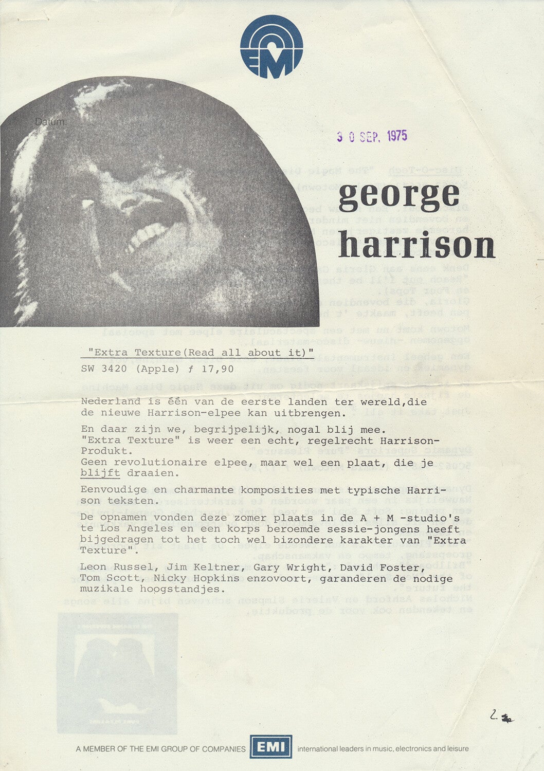 The Beatles - George Harrison - Extra Texture - September 30, 1975 [Holland] - Press Release