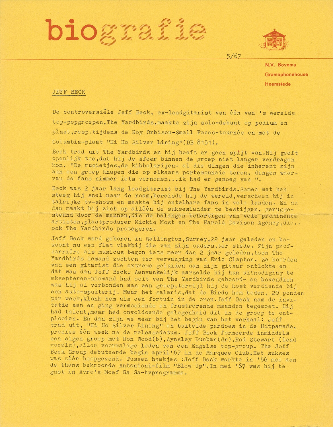 Jeff Beck - Biografie - May 1967 [Holland] - Press Release