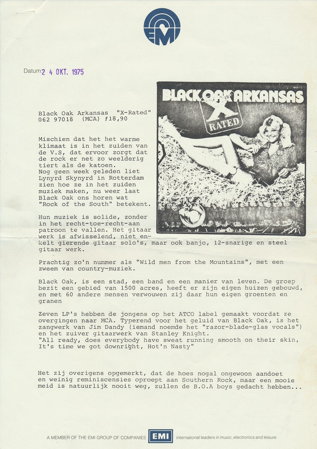 Black Oak Arkansas - X-Rated - October 24, 1975 [Holland] - Press Release