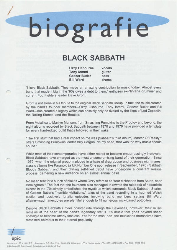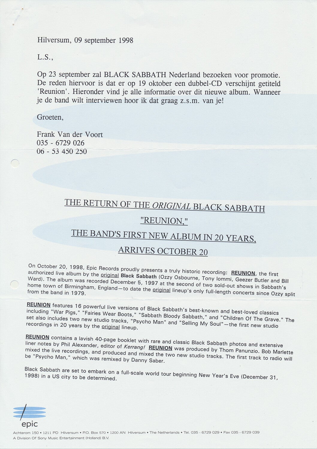 [102962] Epic / Sony Music Entertainment (Holland) B.V. Hilversum. September 9, 1998. 21.0x29.7cm. 3pp. Condition: excellent, folded.